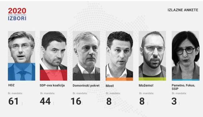 Резултатите на освоени гласови кои се појавија веднаш по затворањето на гласачките места, проектираат 61 мандат за ХДЗ, по што следува коалицијата Рестарт што ја предводи СДП со 44 места и Домовински покрет со 16 парламентарни места.