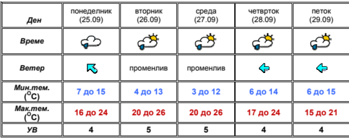 Сончево со мала до умерена облачност и со слаб до умерен ветер од северозападен правец, особено изразен на југоистокот од земјава. Максималната температура ќе биде во интервал од 19 до 27 степени. УВ=5